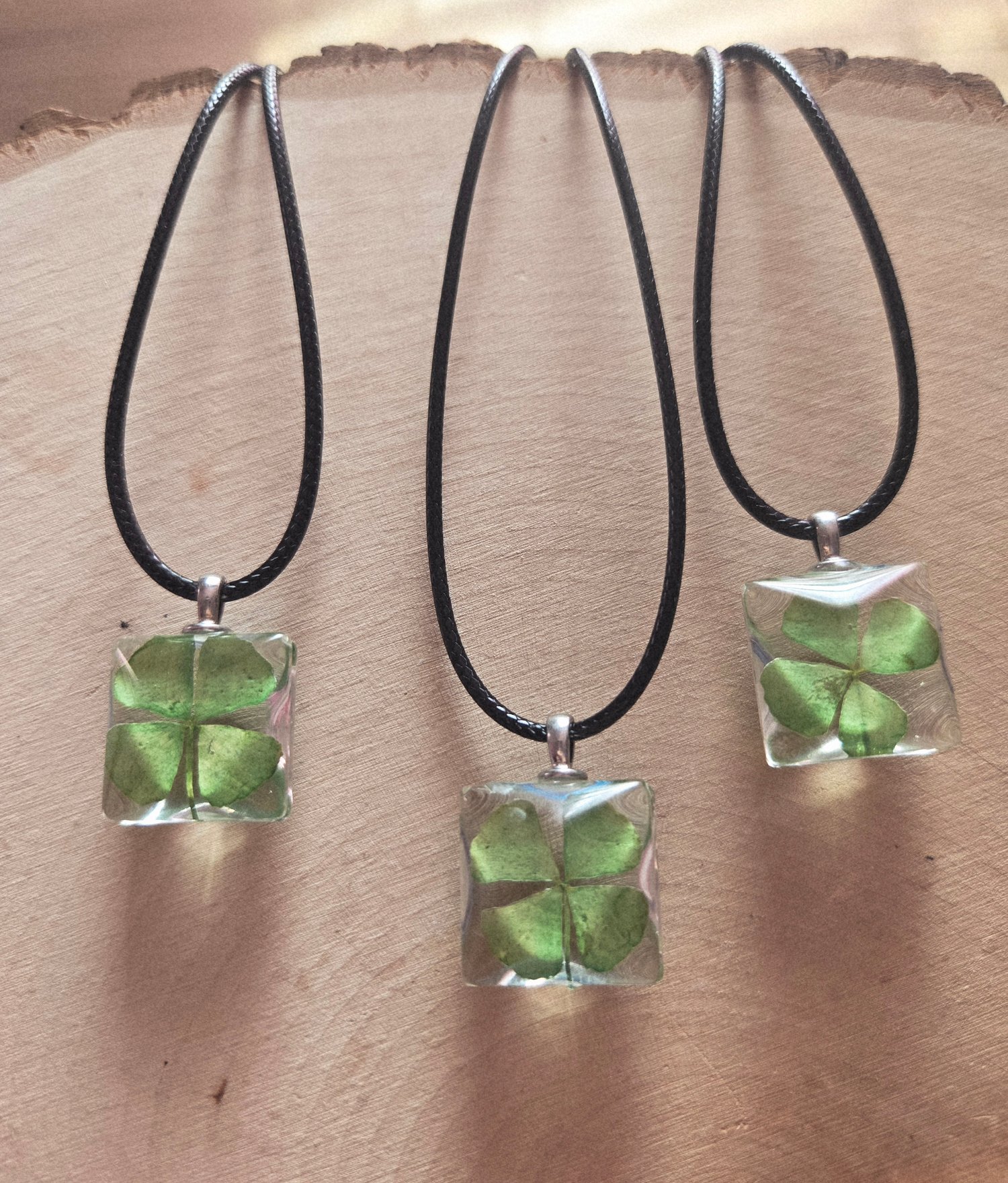 Handmade, preserved 4-leaf clover in square shape resin pendant with a black waxed necklace cord.